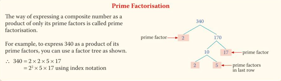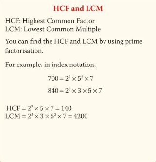 factors and multiples- prime factorisation, index notation, HCF/LCM- powers and roots
