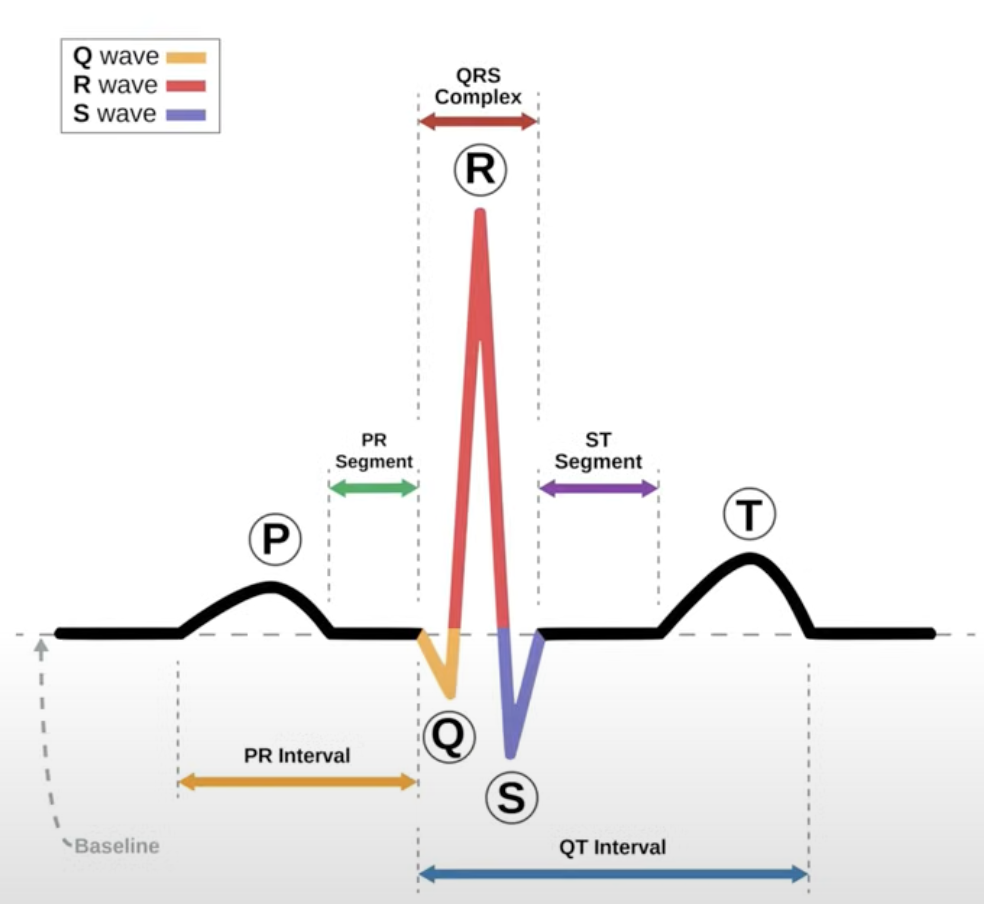 PR interval | Time from start of atrial depolarisation (P wave) to start of ventricular depolarisation (QRS) — includes AV node conduction delay | 0.12–0.22 s | Prolonged → first-degree AV block; Short → pre-excitation (WPW) |