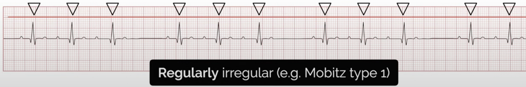 Fixed PR + random dropped QRS: Mobitz II (dangerous, may progress to complete block).