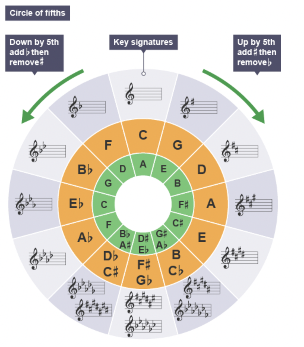 - Working out sharp keys (major) - look at the last sharp, and go up one step