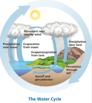 Movement through evaporation, transpiration, condensation, precipitation, and through surface and groundwater driven by solar energy.
