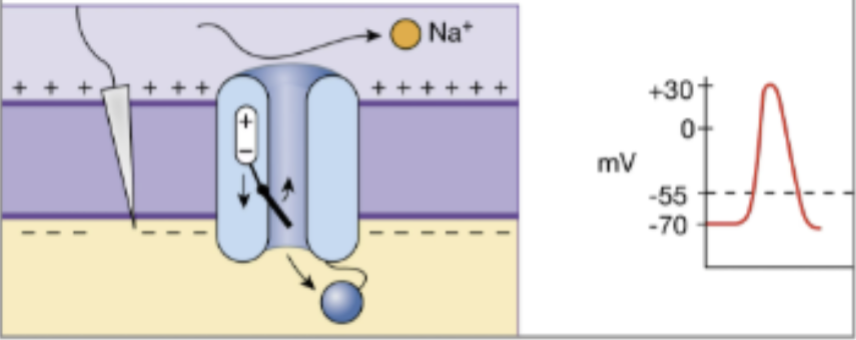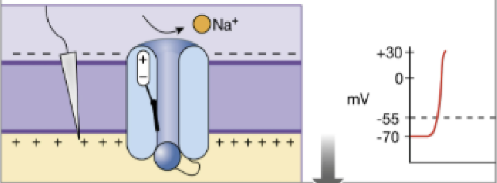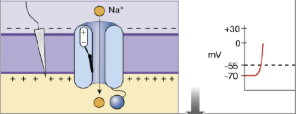 Na+ diffuses across the cell body and starts depolarizing- if it reaches the axon hillock with enough Na+ to reach threshold, the action potential is carried down the axon to trigger voltage-regulated Na+ channels at the axon terminal (Shit starts over).