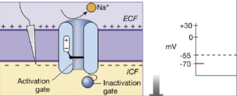 e) During repolarization caused by K+ leaving the cell, the two gates reset to their original positions.