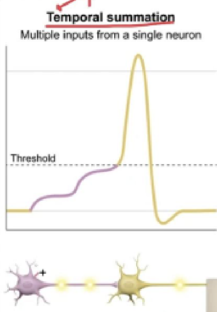 Temporal Summation: Occurs when two graded potentials from one presynaptic neuron occur close together in time. If close enough together in time, it can summate and reach threshold at the trigger zone and initiate an action potential. ESPS’s added up essentially.