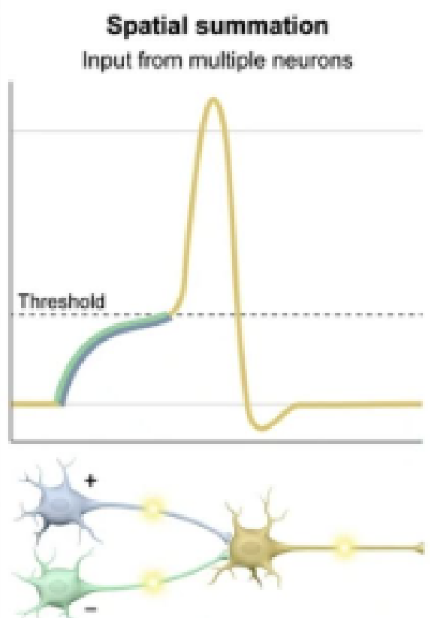 Spatial Summation: Summation of several subthreshold signals results in an action potential.