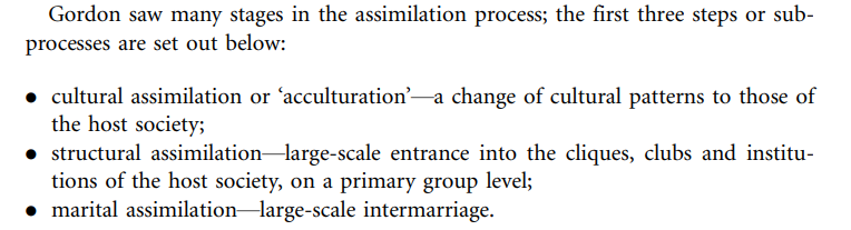 Gordon (1964) assumes that structural assimilation will either accompany or follow cultural assimilation (‘acculturation’) but, as argued in ‘segmented assimilation’ theory (Portes and Zhou 1993), acculturation and upward economic mobility can be de-coupled. One can achieve upward mobility on the basis of limited acculturation (the deliberate retention of ethnic traits, practices and ties).