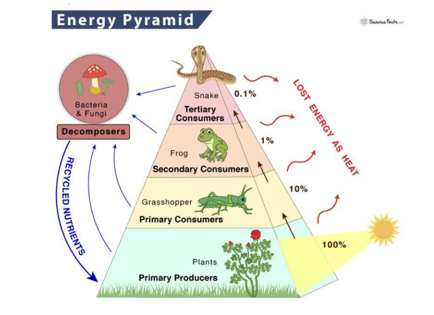 A pyramid of net production represents the loss of energy with each transfer in a food chain.