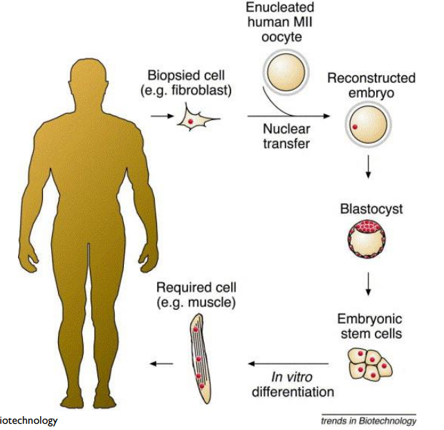 - Isolate skin cells and introduce them into an enucleated oocyte to reconstruct embryo → differentiation.