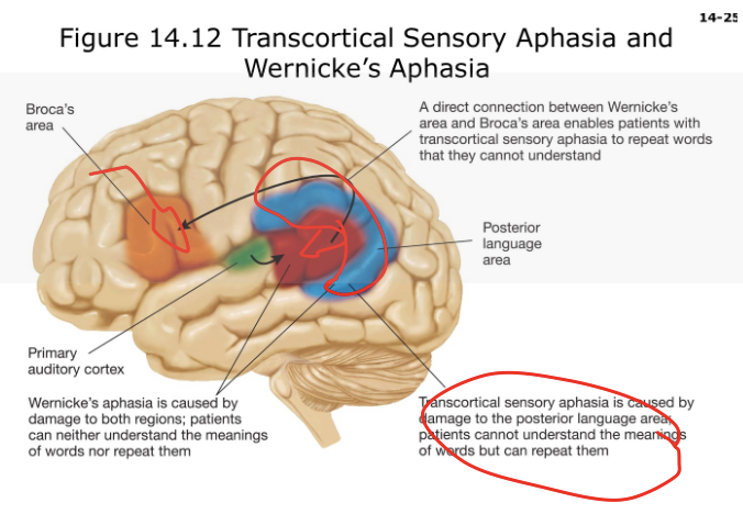 * Transcortical sensory aphasia: Damage to auditory regions surrounding Wernicke’s area (posterior language area)