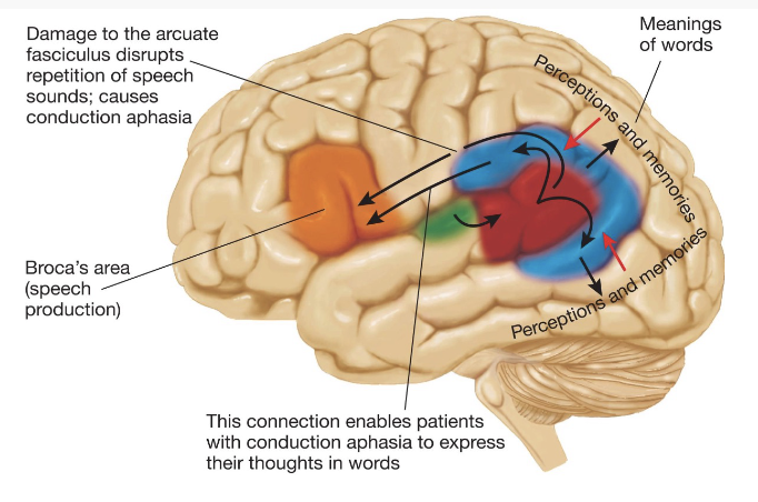 - Arcuate Fasciculus: bundle of axons connecting Wernicke’s and Broca’s area, conveys speech sounds from auditory cortex to frontal lobe