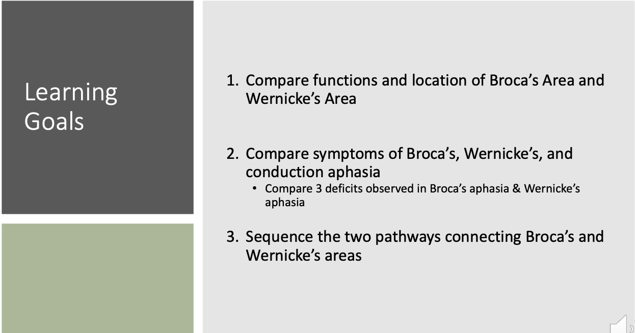 * articulation - broca’s aphasia: difficulty producing language especially speech