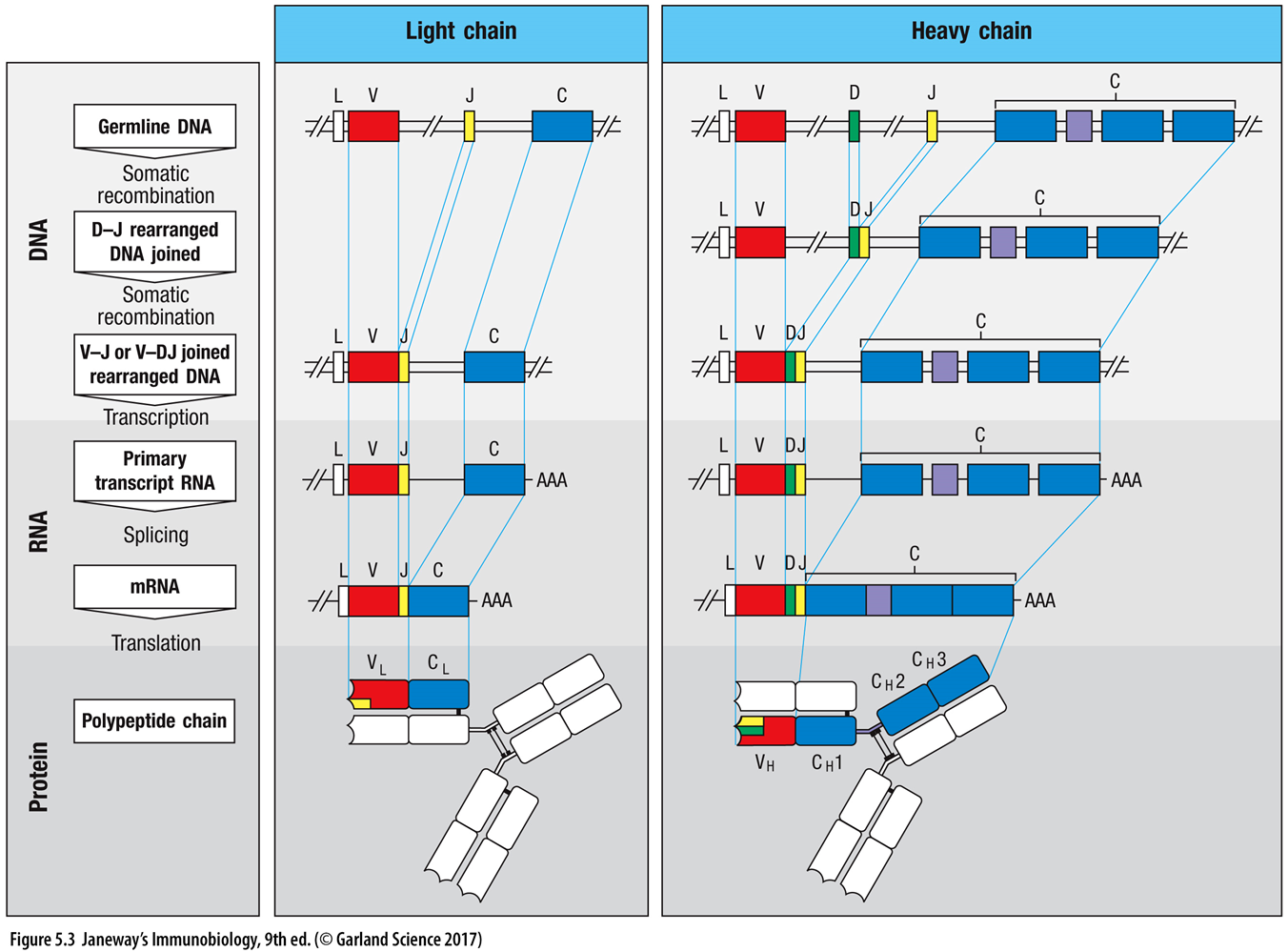 18: diagram, showing germline organisation of gene segments maybe - joining together of different regions and recombination - encoding variability
