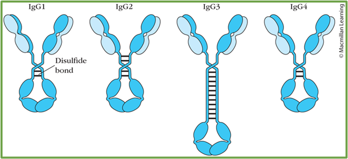 6: 5 antibody types distinguished by structure and function. IgG is broken down into a further 4 subtypes. LOOK AT 2ND YEAR SLIDES