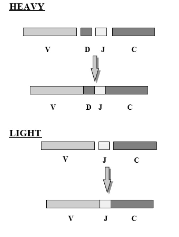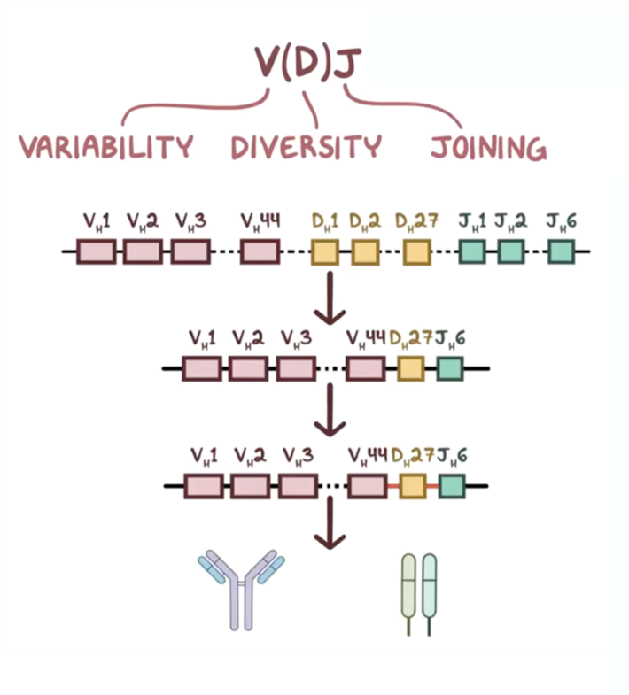V(D) J recombination is where the variable (V), diversity (D) and joining (J) segments recombine in developing B cells. Each person inherits multiple of these segments and they randomly recombine - heavy chains undergo V, D and J recombination whereas light (kappa and lambda) chains only recombine V and J segments. This shuffles the segments to create different combinations with purposeful recombinational inaccuracy to create additional variation and a wide range of antibodies. This process is mediated by RAG 1 /2 (recombination activating genes) enzymes which cut and join different segments.