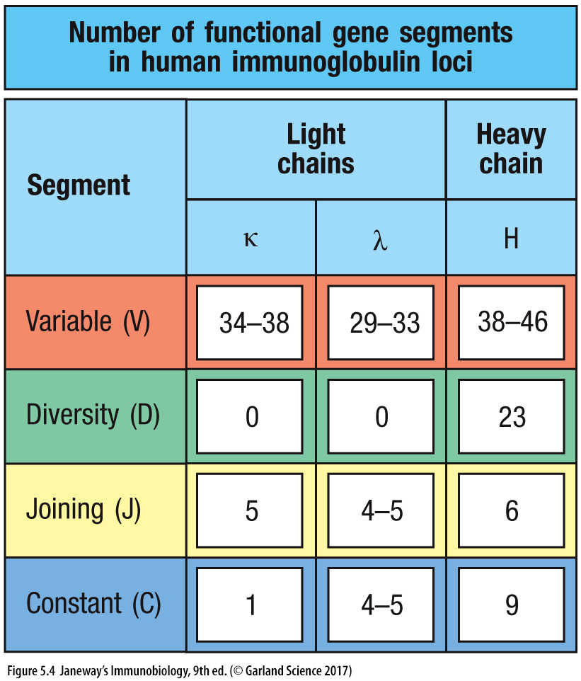 17: 30 different gene loci for variability region. Gene segments which encode the heavy and light chains are organised into three genetic loci - kappa, lambda and heavy chain loci. Each of these can assemble a complete V region sequence. Each locus is found on a different chromosome and organised slightly differently. Instead of the heavy chain locus having 1 C region, it contains multiple consecutive C regions, each corresponding to a different isotype. The total length of the heavy chain locus is more than 2 megabases (1 megabase = 1 million bases)