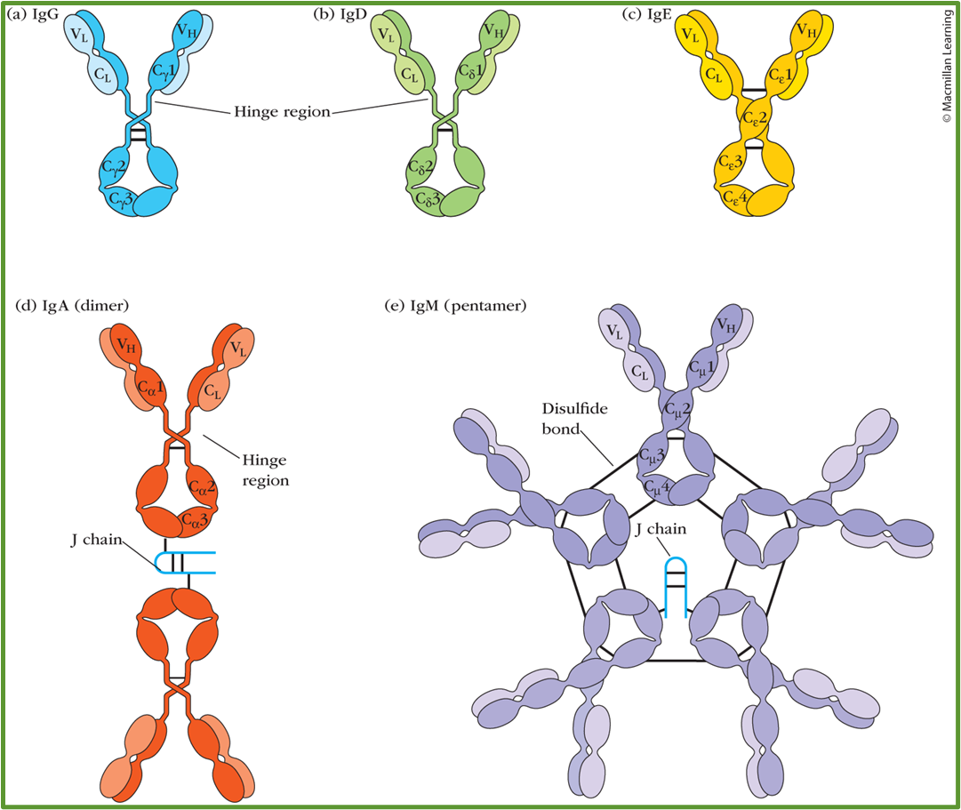 IgM = pentamer, first antibody to appear, undergoes class switching to other types, aids in removal of apoptotic cells