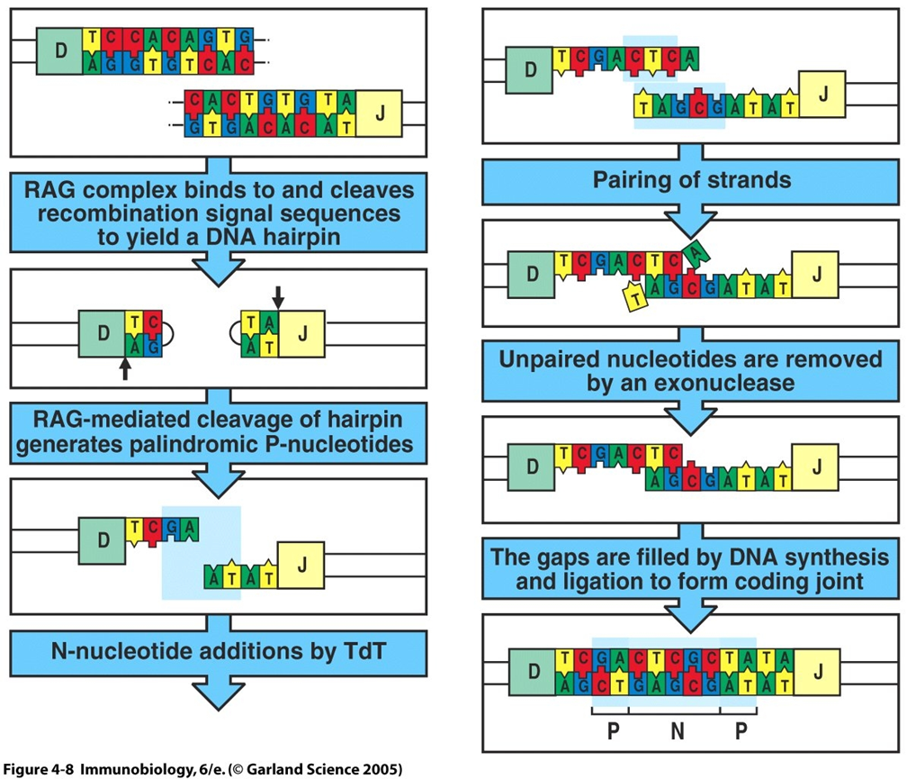 hairpin cleavage by RAG → palindromic P-nucleotides