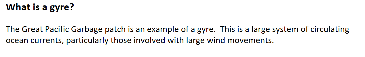 The Great Pacific Garbage patch is an example of a gyre. This is a large system of circulating ocean currents, particularly those involved with large wind movements.