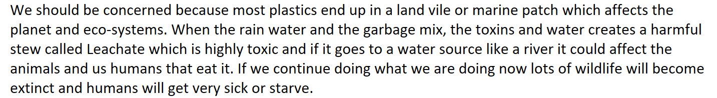 We should be concerned because most plastics end up in a land vile or marine patch which affects the planet and eco-systems. When the rain water and the garbage mix, the toxins and water creates a harmful stew called Leachate which is highly toxic and if it goes to a water source like a river it could affect the animals and us humans that eat it. If we continue doing what we are doing now lots of wildlife will become extinct and humans will get very sick or starve.