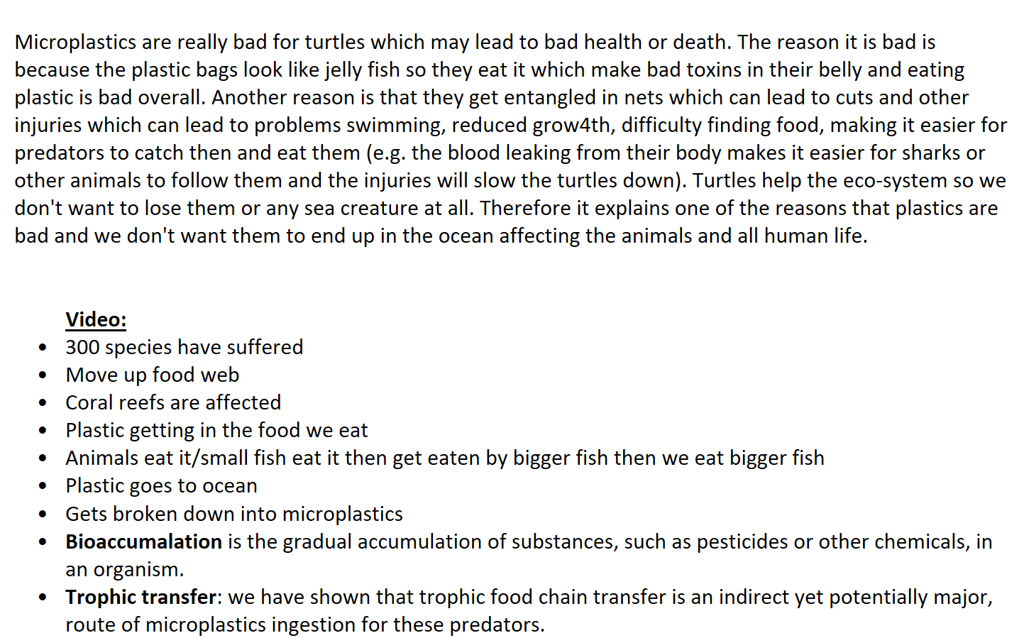 Microplastics are really bad for turtles which may lead to bad health or death. The reason it is bad is because the plastic bags look like jelly fish so they eat it which make bad toxins in their belly and eating plastic is bad overall. Another reason is that they get entangled in nets which can lead to cuts and other injuries which can lead to problems swimming, reduced grow4th, difficulty finding food, making it easier for predators to catch then and eat them (e.g. the blood leaking from their body makes it easier for sharks or other animals to follow them and the injuries will slow the turtles down). Turtles help the eco-system so we don't want to lose them or any sea creature at all. Therefore it explains one of the reasons that plastics are bad and we don't want them to end up in the ocean affecting the animals and all human life.