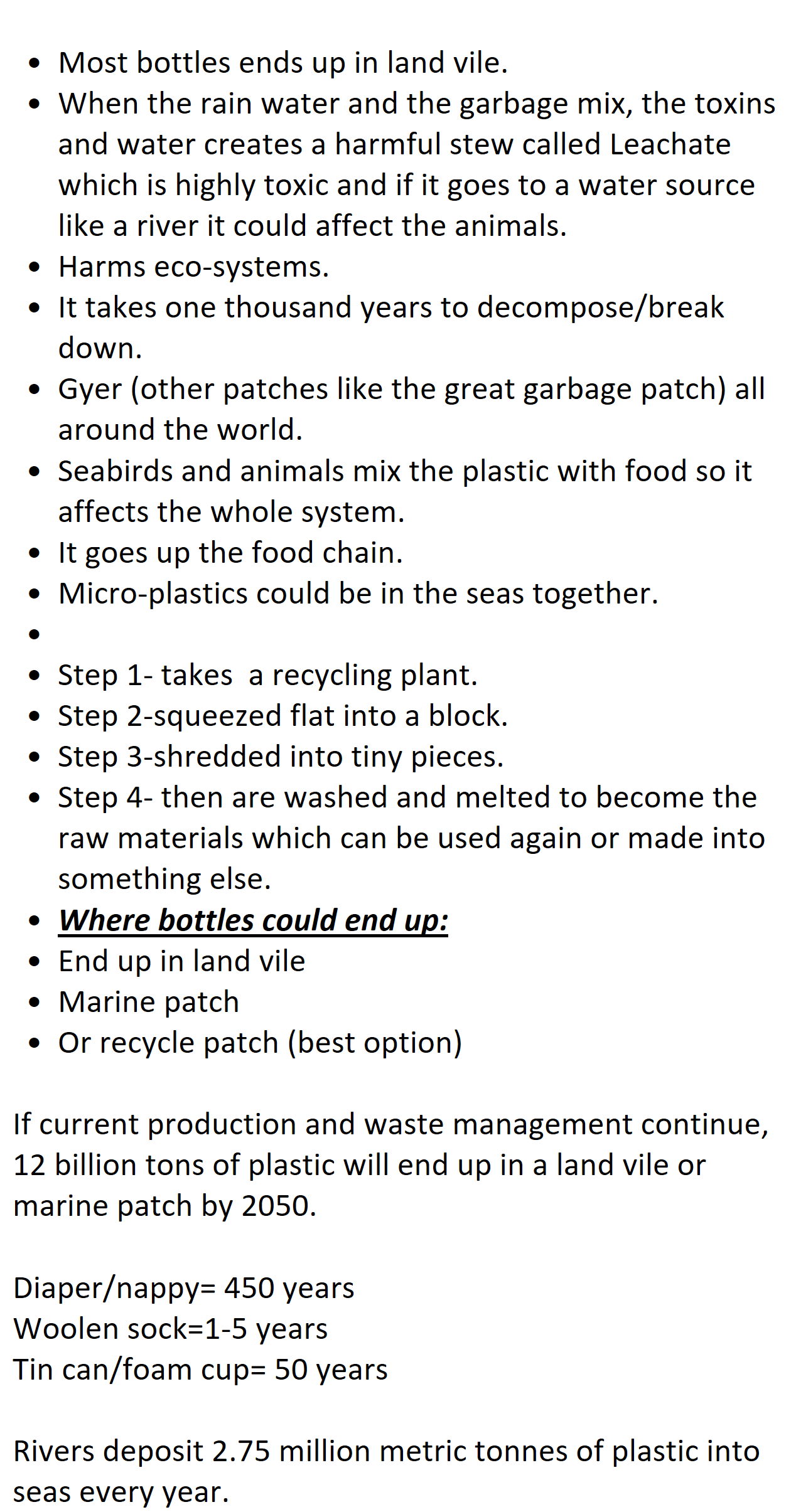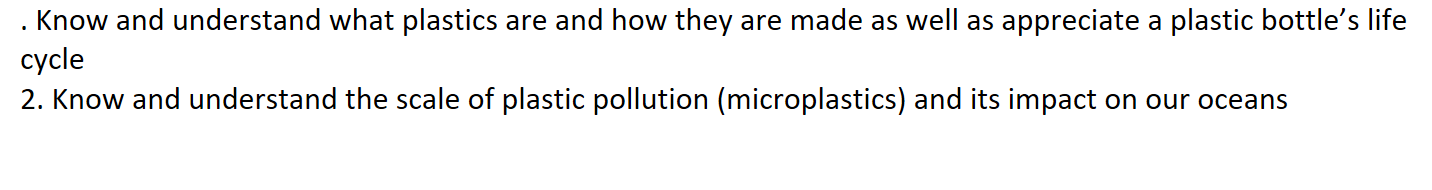 . Know and understand what plastics are and how they are made as well as appreciate a plastic bottle’s life cycle