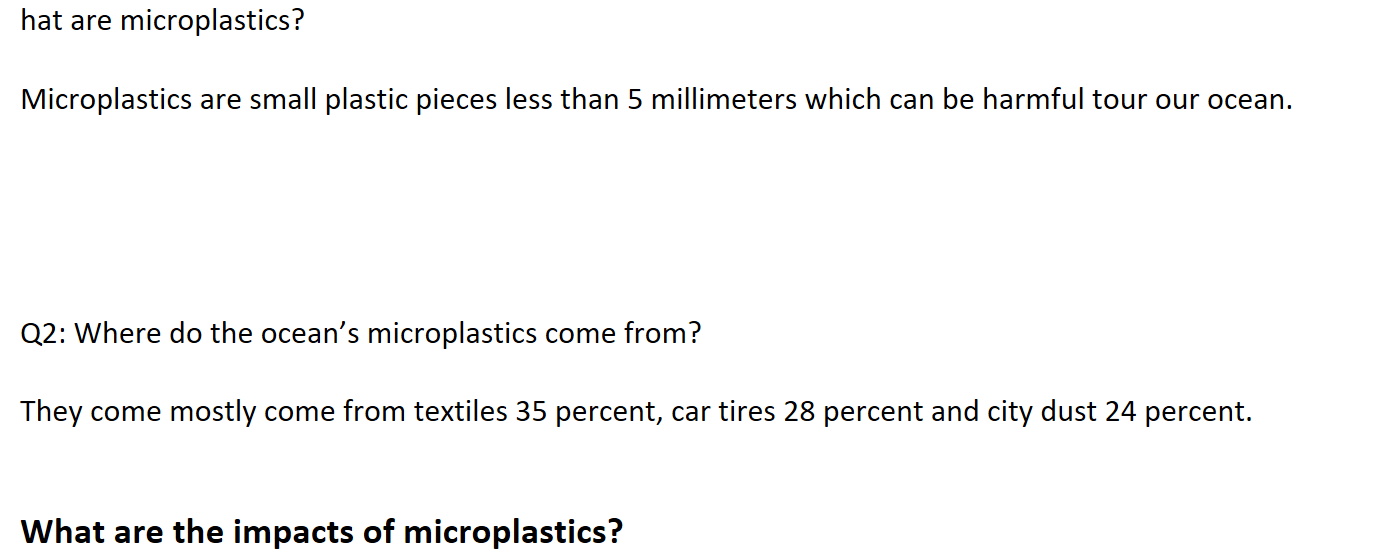 Microplastics are small plastic pieces less than 5 millimeters which can be harmful tour our ocean.
