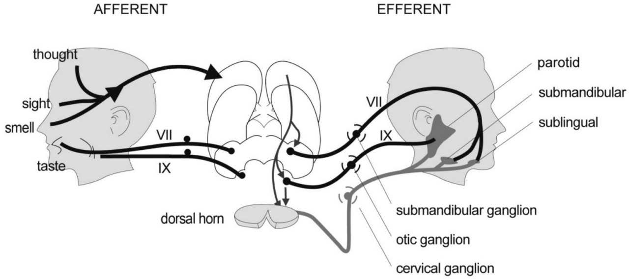 parasympathetic efferent pathways for the sublingual and submandibular glands are from the facial nerve via the submandibular ganglion and for the parotid gland from the glossopharyngeal nerve via the otic ganglion