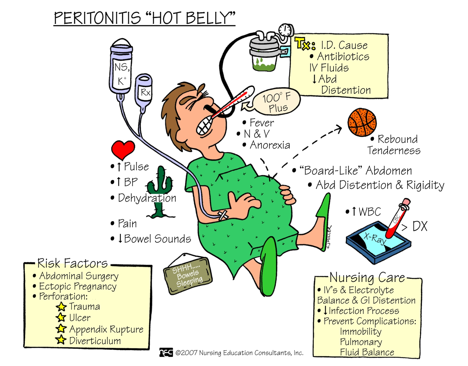 Rebound tenderness, anorexia, n/v, peristalsis is diminished followed by paralytic ileus