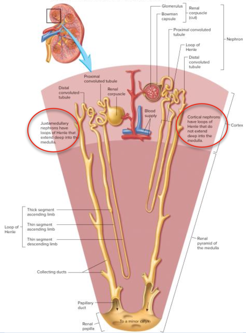 Juxtamedullary Nephrons: 15%, deep renal corpuscle, long loop of Henle.
