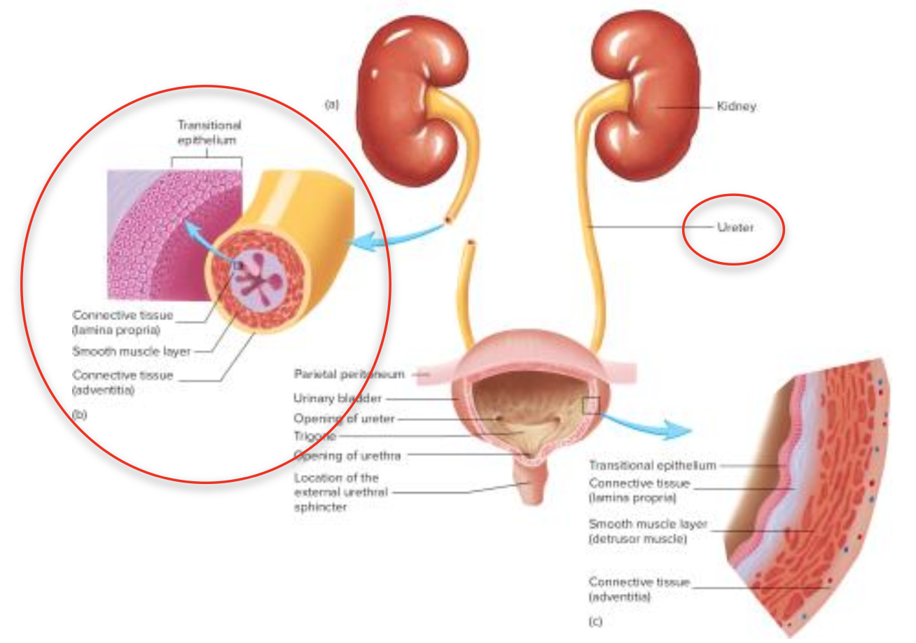 Ureteral Structure: Lined with transitional epithelium to accommodate urine flow.