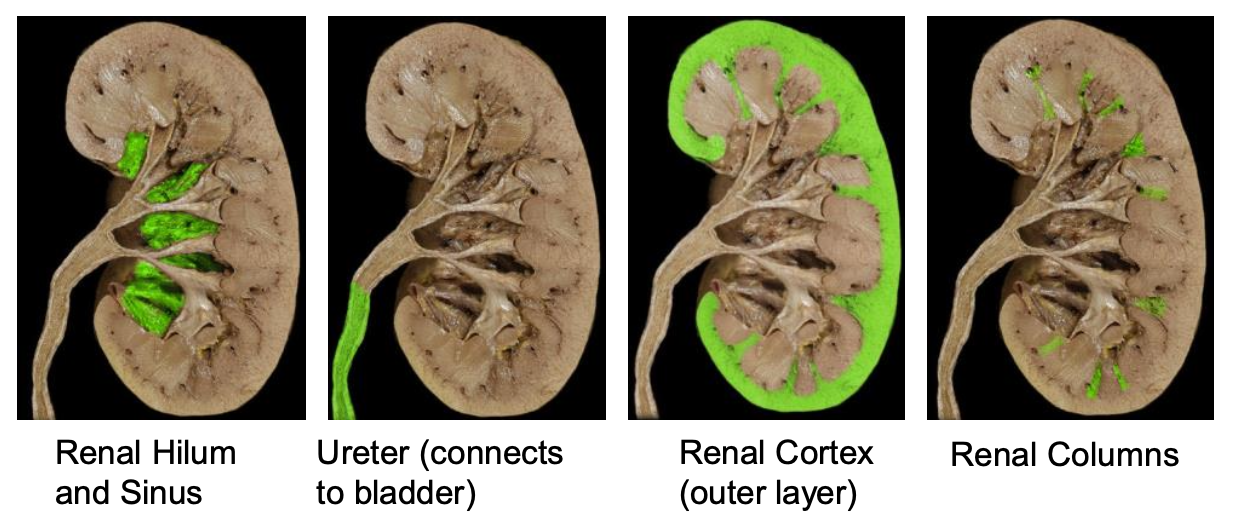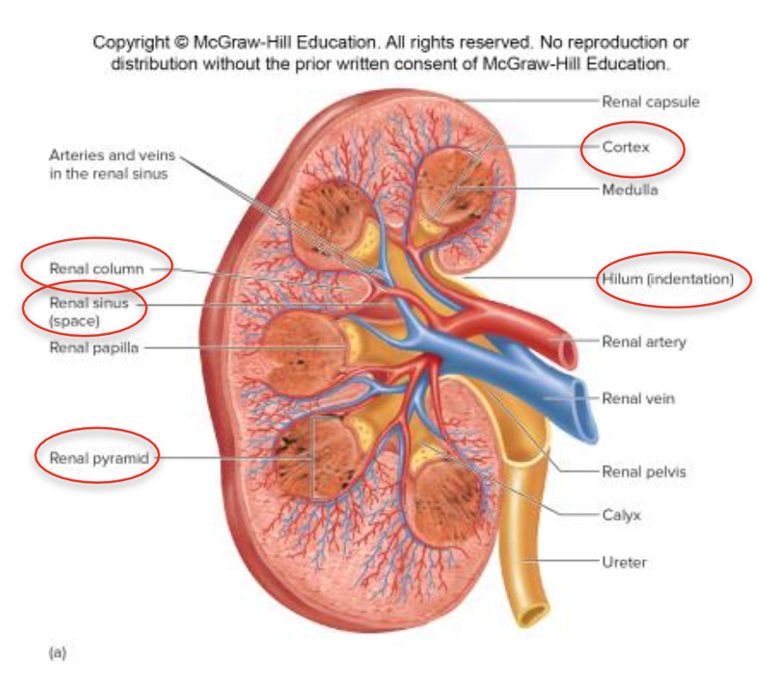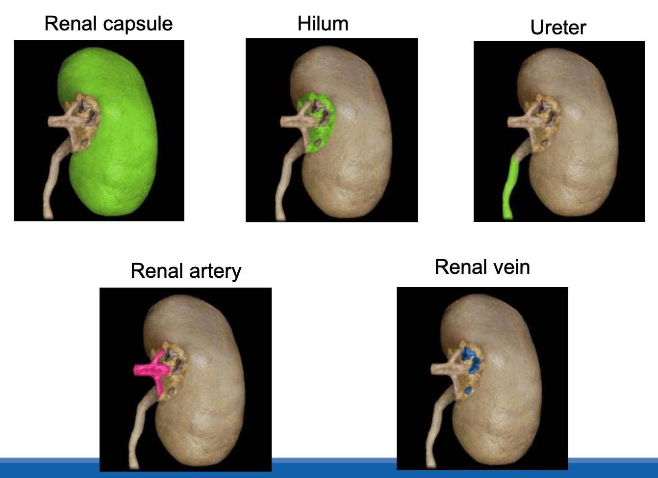 Hilum: Medial concave surface where the renal artery and nerves enter, and the renal vein, ureter, and lymphatics exit.