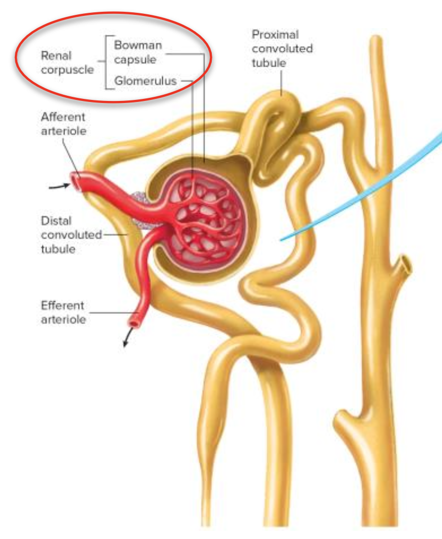 Renal Corpuscle: Glomerulus and Bowman capsule; site of blood filtration.