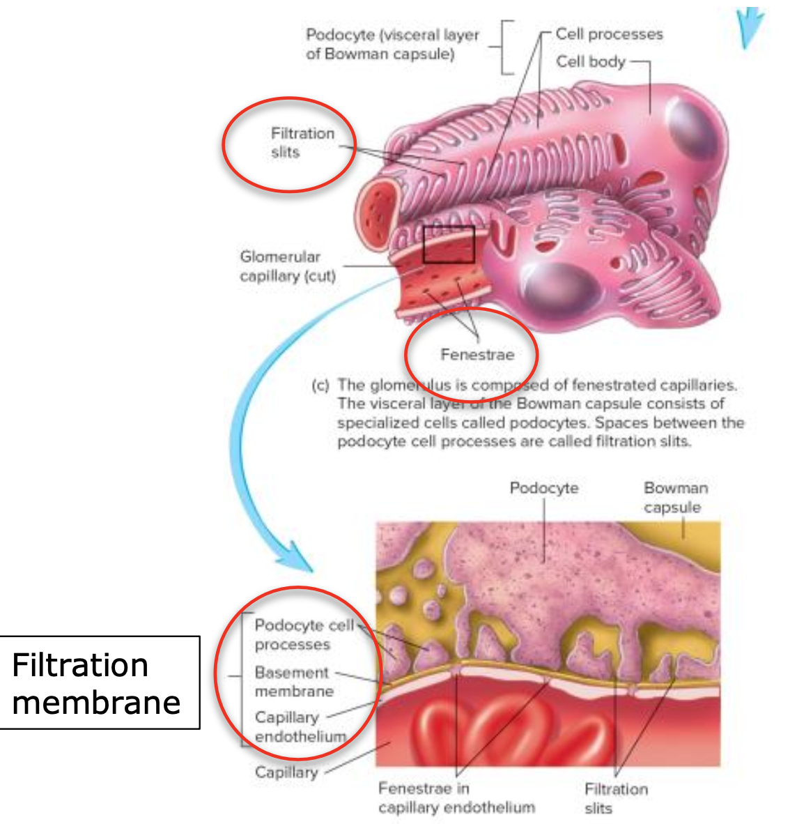 Filtration Slits: Between podocyte cell processes to facilitate filtration.
