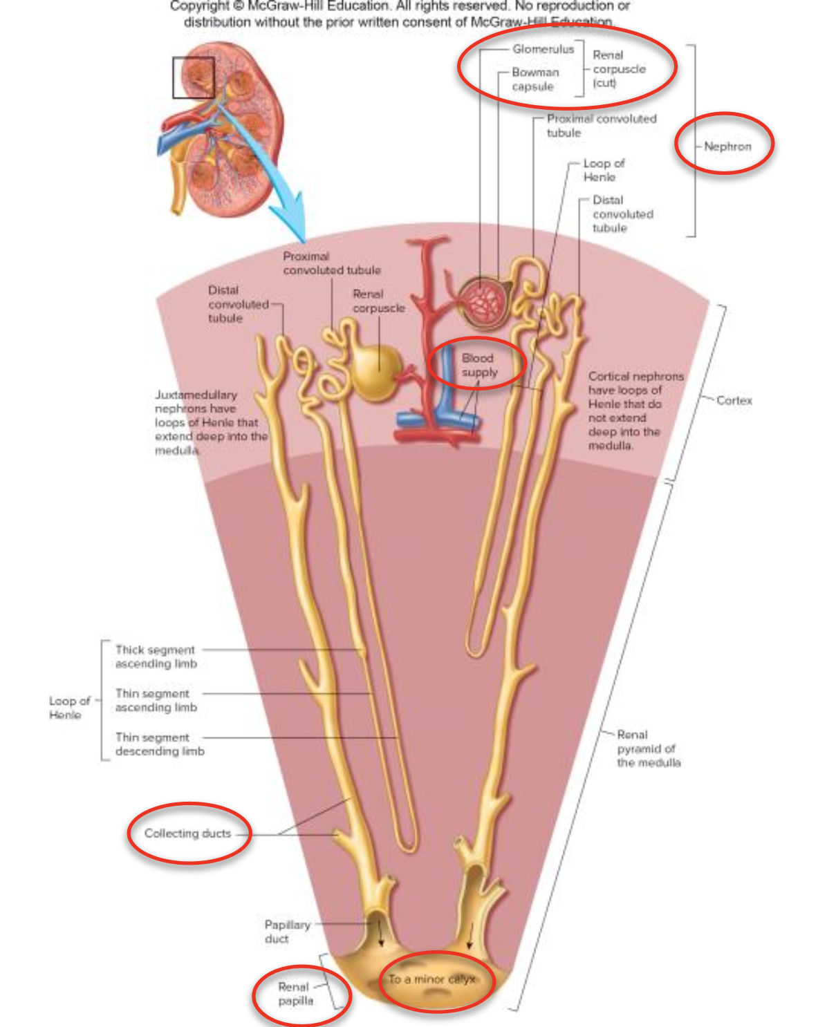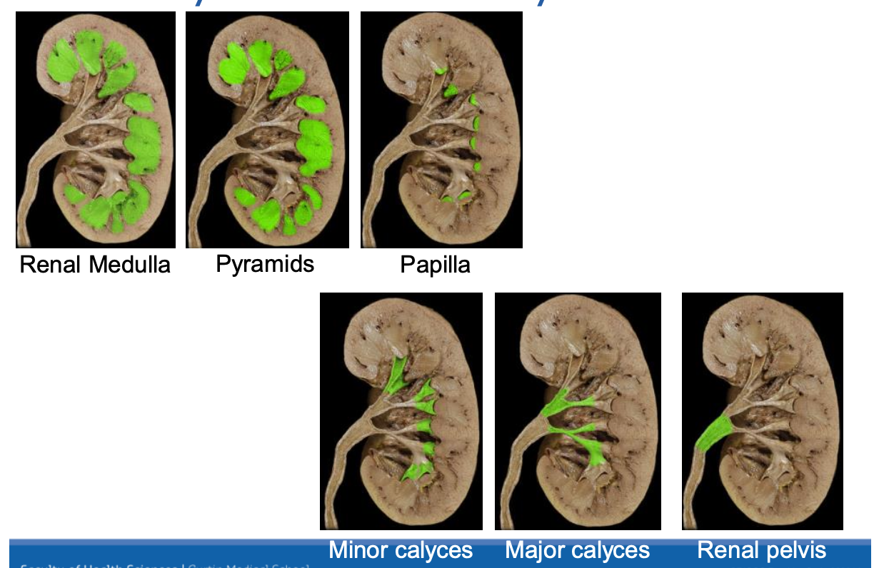 Urine flow: nephron → papillary ducts → minor calyces → major calyces → renal pelvis → ureter