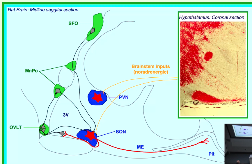 Circumventricular Organs: Regions like the Organum Vasculosum of the Lamina Terminalis (OVLT), Subfornical Organ (SFO), and Median Preoptic Nucleus (MnPo) can sense factors in the blood and project to the SON/PVN.