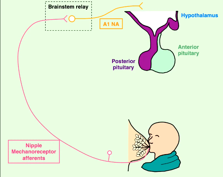 This triggers the release of oxytocin from the posterior pituitary and prolactin from the anterior pituitary.