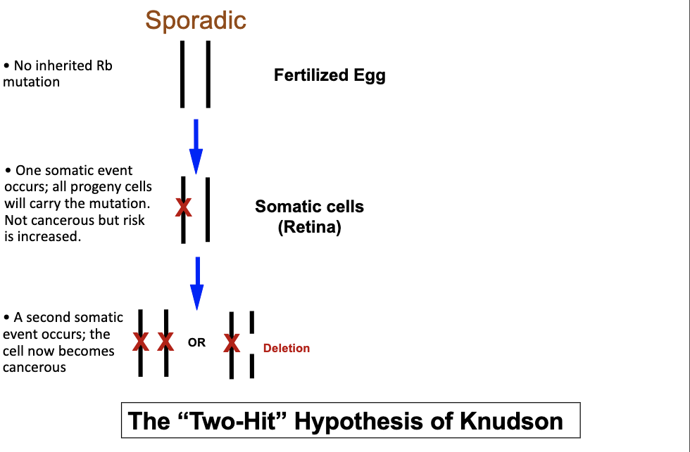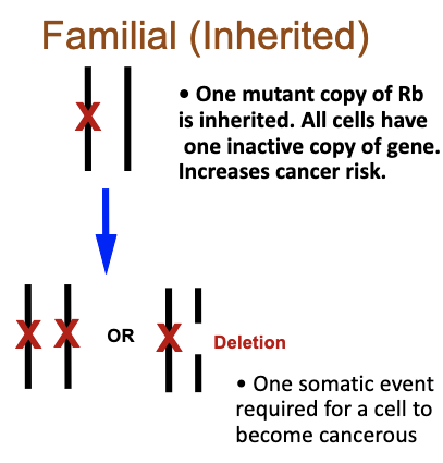 Familial: Inherit one mutant allele from a parent (1 genetic) second mutant allele develops in somatic tissue (1somatic)