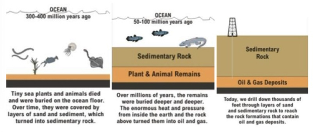 Cruise oil, coal and gas are fossil fuels. They are formed over millions of years, from the remains of dead organisms,