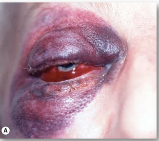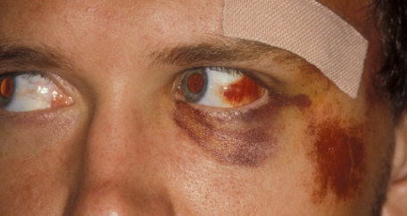 Typically referred to as a “black eye”, often resulting from blunt trauma to the eyelid or forehead.