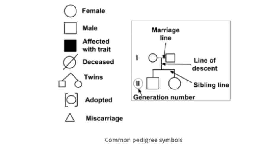 Pedigree analysis describes the process of interpretation of information displayed as a family tree. The family tree or pedigree is constructed using a standardised set of symbols and will include information about the disease status of each individual.