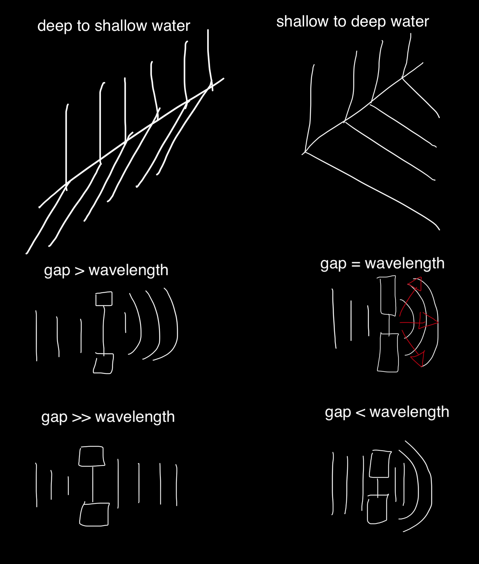 • Sound can diffract around corners and through gaps because its wavelength is comparable to the size of obstacles, allowing it to be heard around barriers (e.g., buildings).