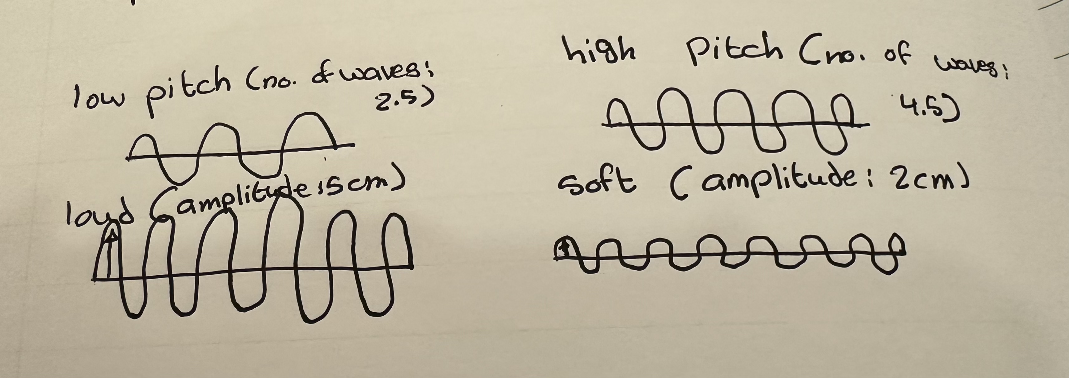 Loudness: Related to amplitude; larger amplitudes yield louder sounds, whereas smaller amplitudes produce quieter sounds.