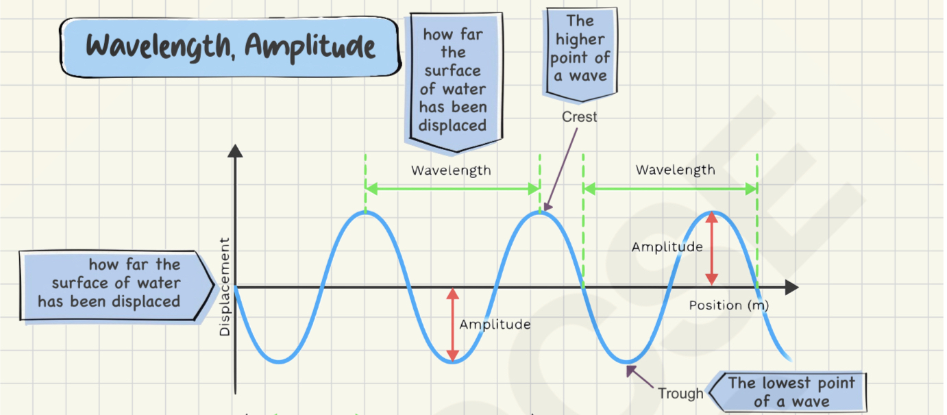 Wavelength | Distance between consecutive peaks or identical points. | Meters (m) |