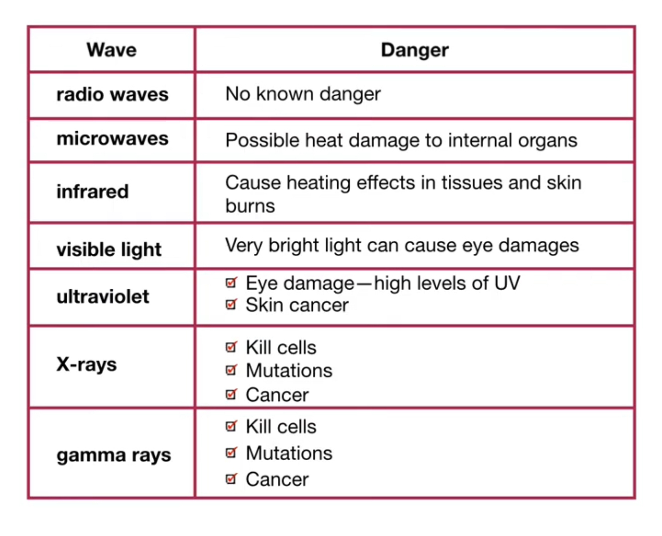 Higher frequency waves can be ionizing, leading to cellular damage and cancer (e.g., UV, X-rays, gamma rays).