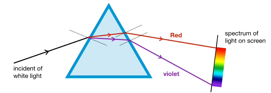 Experiment: When white light enters a triangular glass prism, it refracts at each surface, resulting in a spectrum displayed on a screen.
