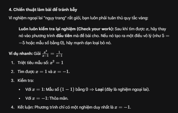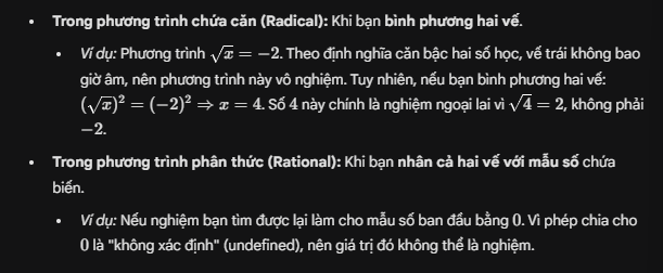 Vô nghiệm (No solution) | Biến x bị triệt tiêu nhưng hai vế còn lại là hai số khác nhau (a = b). | 5x + 3 = 5x + 10 (vô lý) |