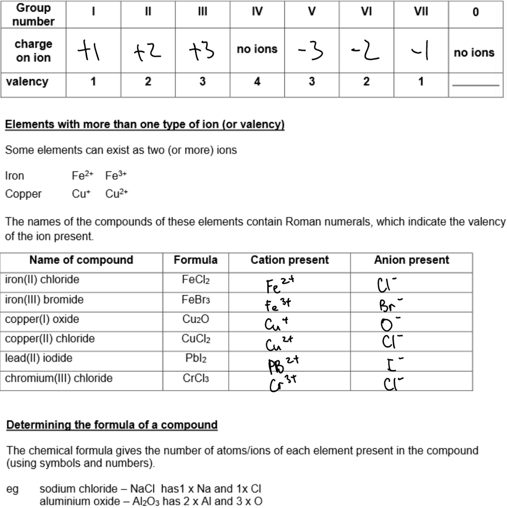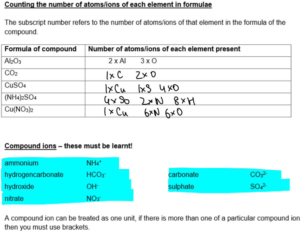 Chemical formula: A way to express the elements (atoms or ions) in a compound, showing the number of atoms/ions of each element using symbols and numbers.