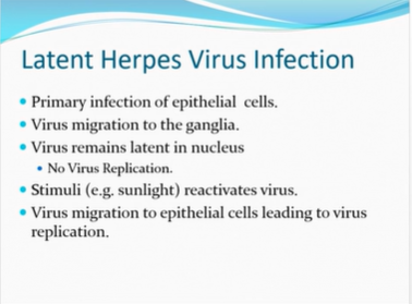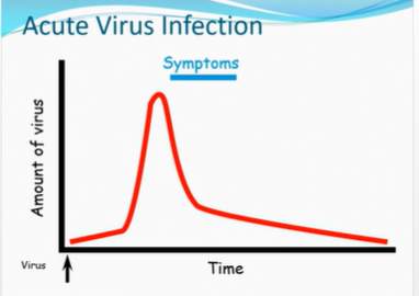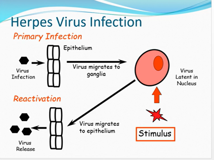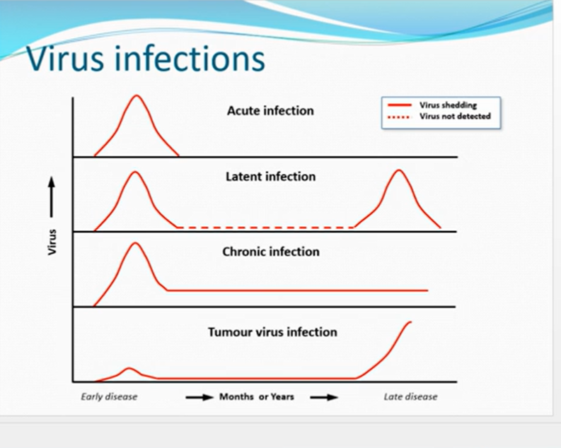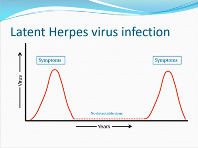 virus replicates, gets infected, replicates, dominates until host antibody overcomes infection, virus amount goes down but hides away could go up to many years, trigger hits a virus and rereplicates and similar pattern repeats