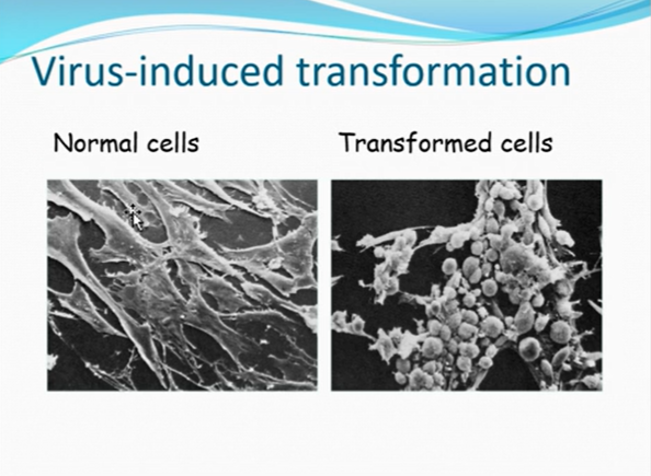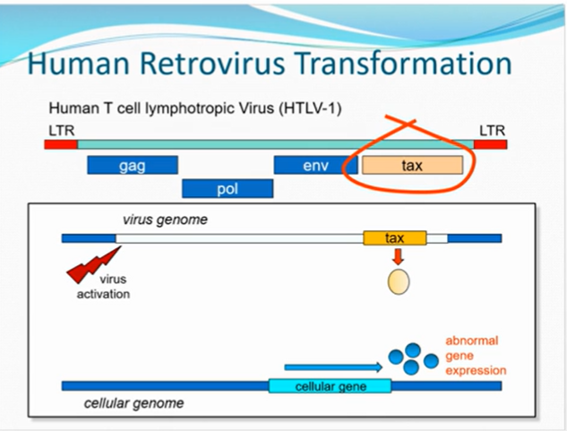 HTLV-1 -tax protein, infects host cell, virus activated and tax protein affects cellular genome and causes abnormal gene expression (how malignant transformation happens)