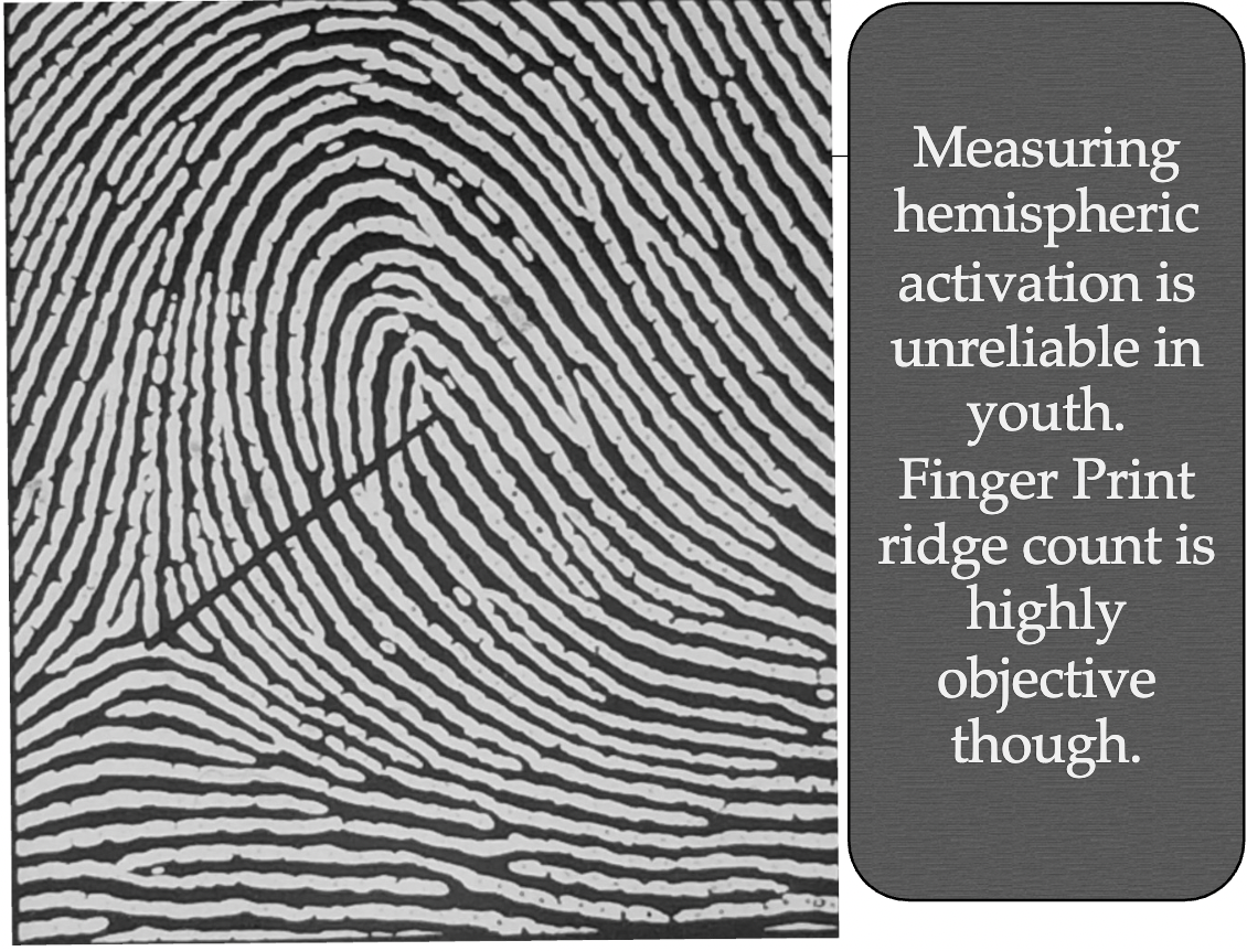 Low ridge count signifies a slower cell division rate during gestation and results in a smaller left hemisphere development.